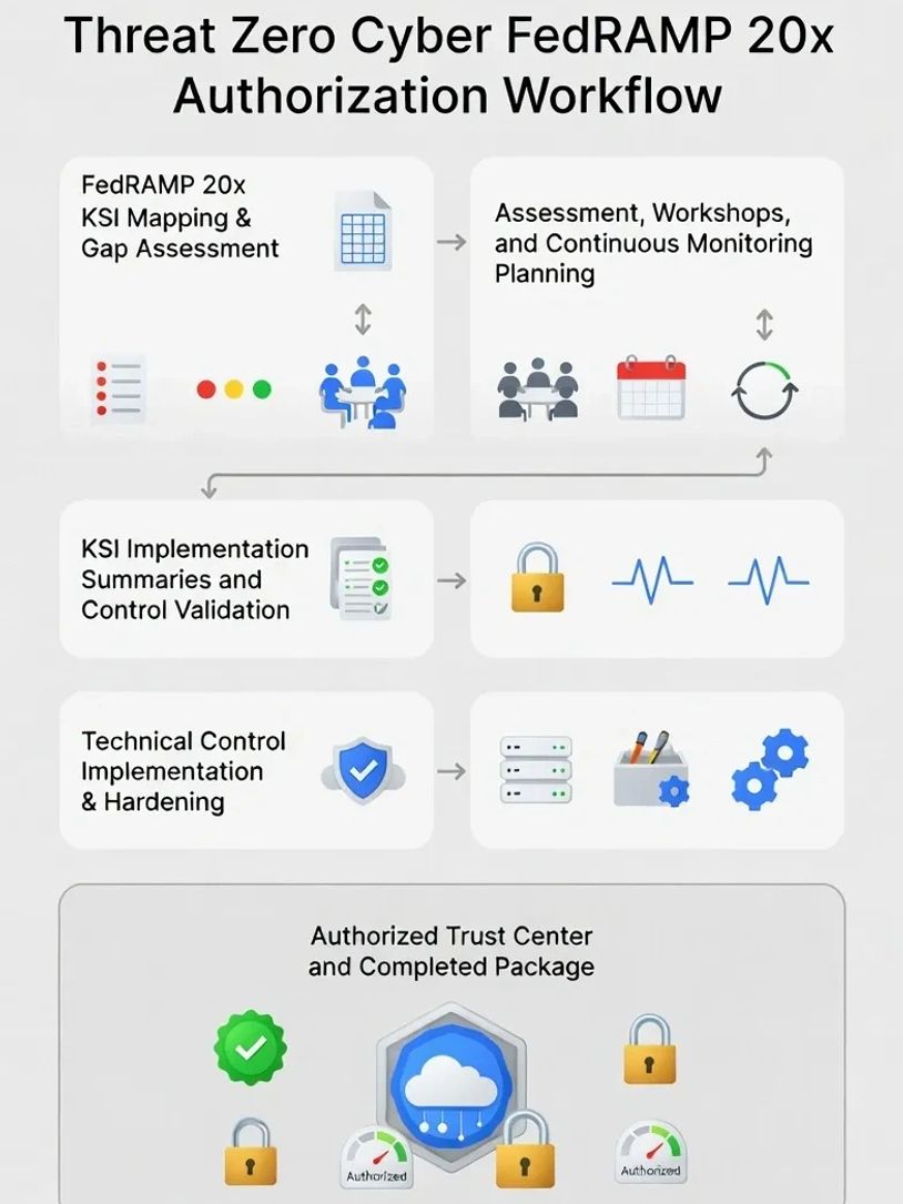 Threat Zero Cyber's FedRAMP 20x Authorization Workflow delivers a proven, structured path for SaaS providers to achieve FedRAMP 20x accreditation across applicable impact levels. Starting with KSI mapping and gap assessment, progressing through collaborative workshops, control validation, and technical hardening, the process culminates in an Authorized Trust Center and a complete authorization package ready for FedRAMP PMO submission.